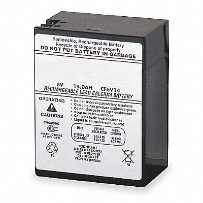 Battery Battery Chemistry Sealed Lead Acid Battery Capacity 14 Ah Compatible with Series ELT36 ELT50 Recharge Time 168 hr Voltage 6 V 250 and 187 Flag Terminal Connection Rated Life 5 yr Black Housing Color Compatible Grainger Part Number 4PG67 4PG95 4PG96 Compatible Mfr Model Number ELU3X ELT36 ELT50 Overall Depth 2 3/4 in Overall Height 5 1/2 in Overall Width 4 1/4 inMRO4PH12