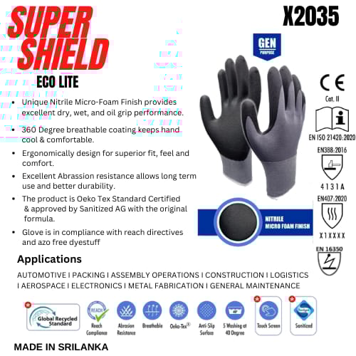Unique Nitrile Micro-Foam Finish provides excellent dry, wet, and oil grip performance Complies to EN 16350 -Anti-static features Ergonomical design for superior fit, feel and comfort The product is Oeko Tex Standard Certified & approved by Sanitized AG with the original formula. Glove is in compliance with reach directives and azo free dyestuff Performance rating 4131A [EN 388:2016] EN407:2020, EN16350